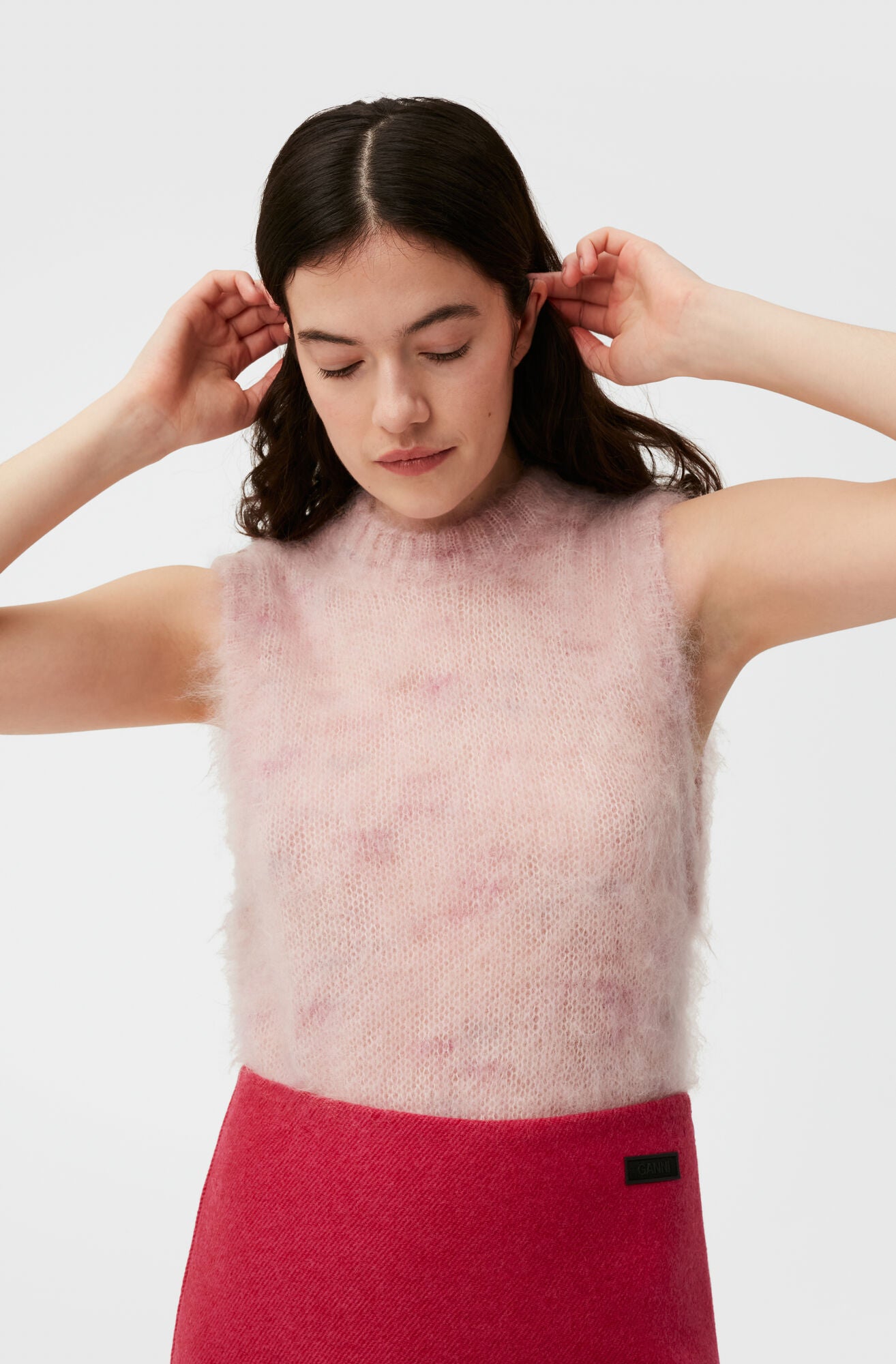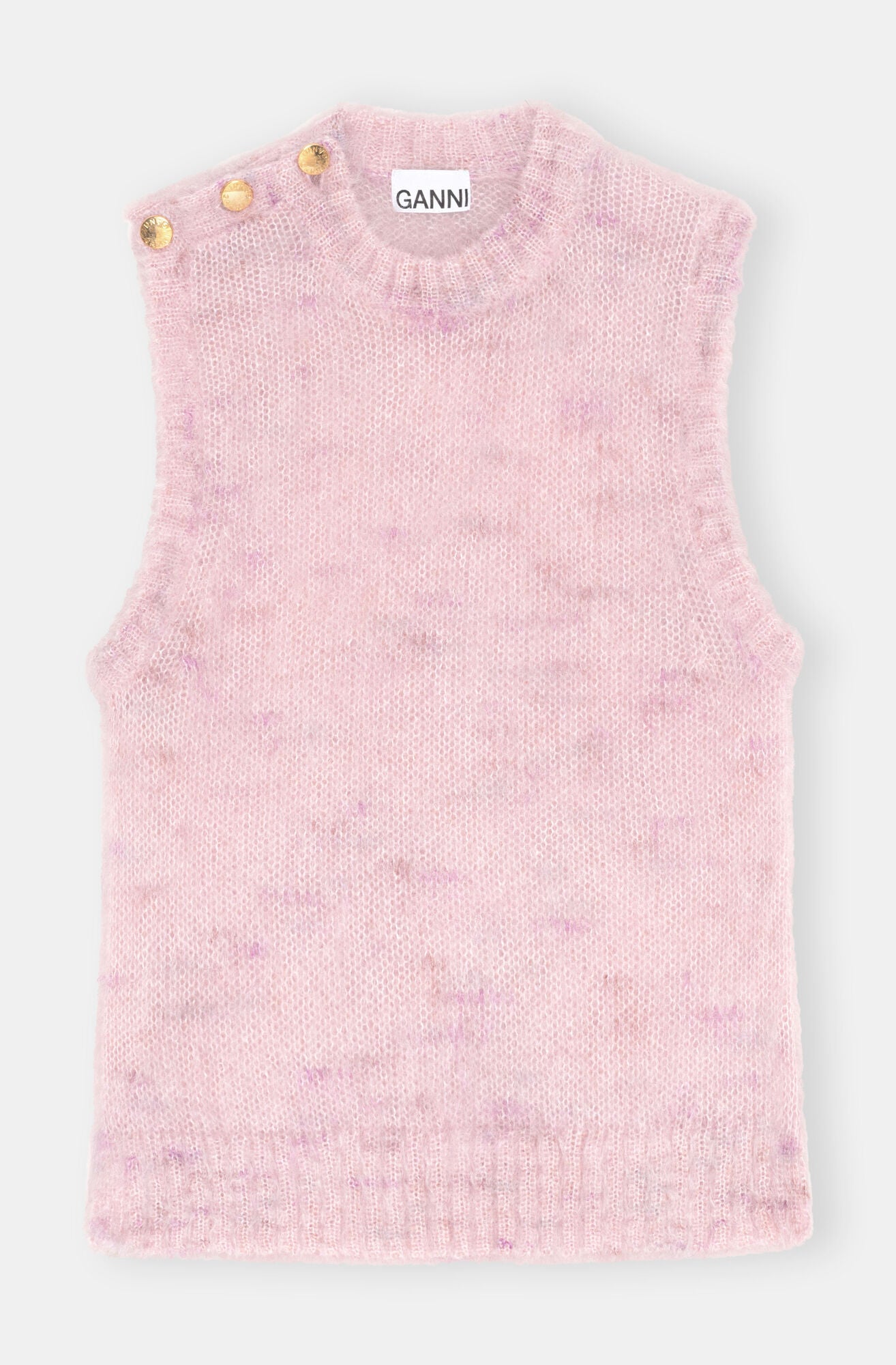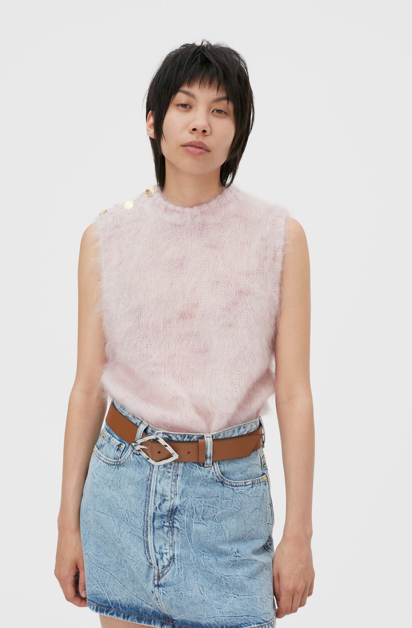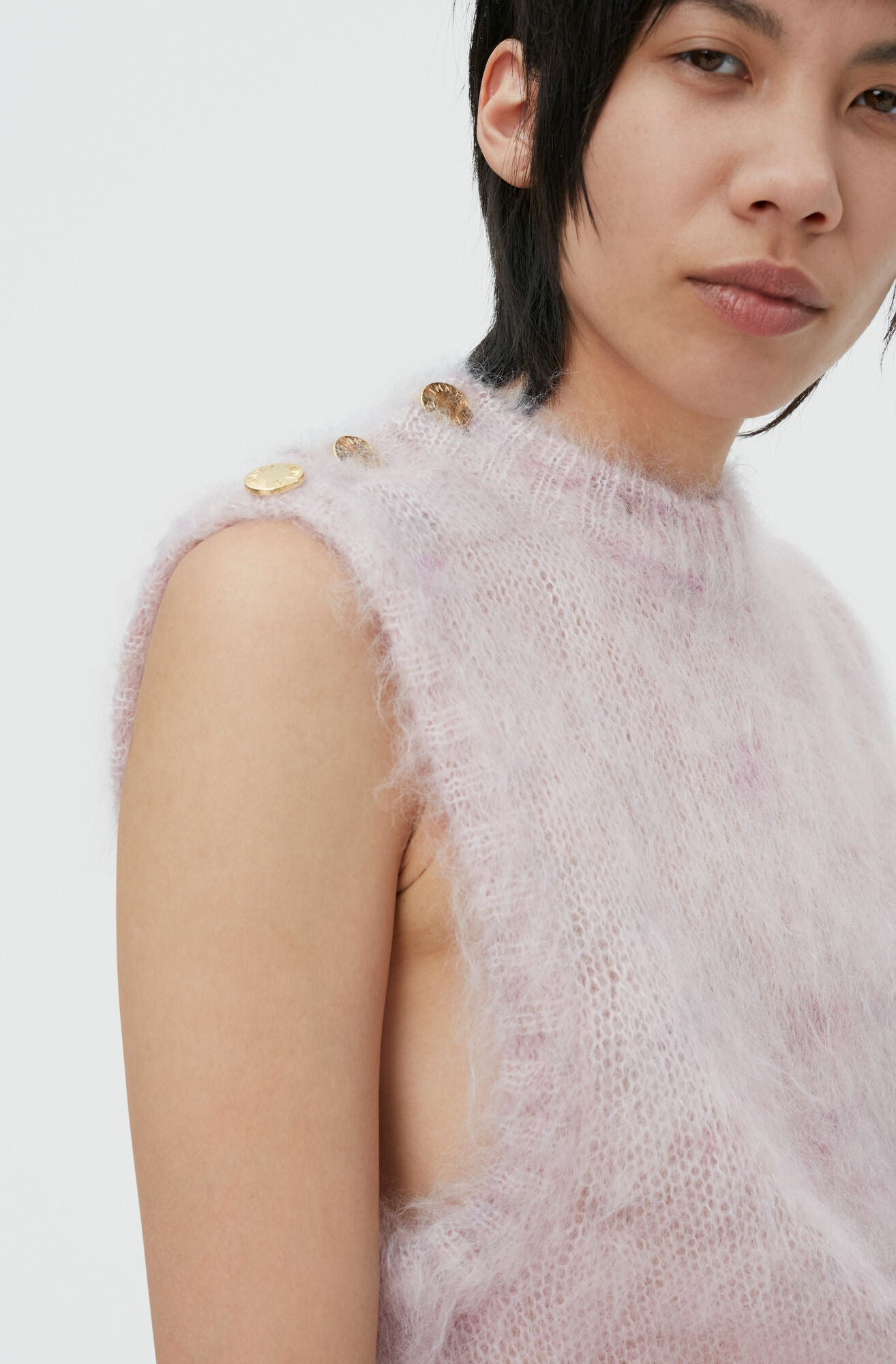 針織背心採用柔軟的馬海毛混紡面料製成,輕盈保暖,兼具彈性、高舒適度與耐穿。肩部點綴金屬質感鈕扣,為簡約輪廓增添亮點細節,展現 GANNI 獨有的活潑俏皮氛圍。