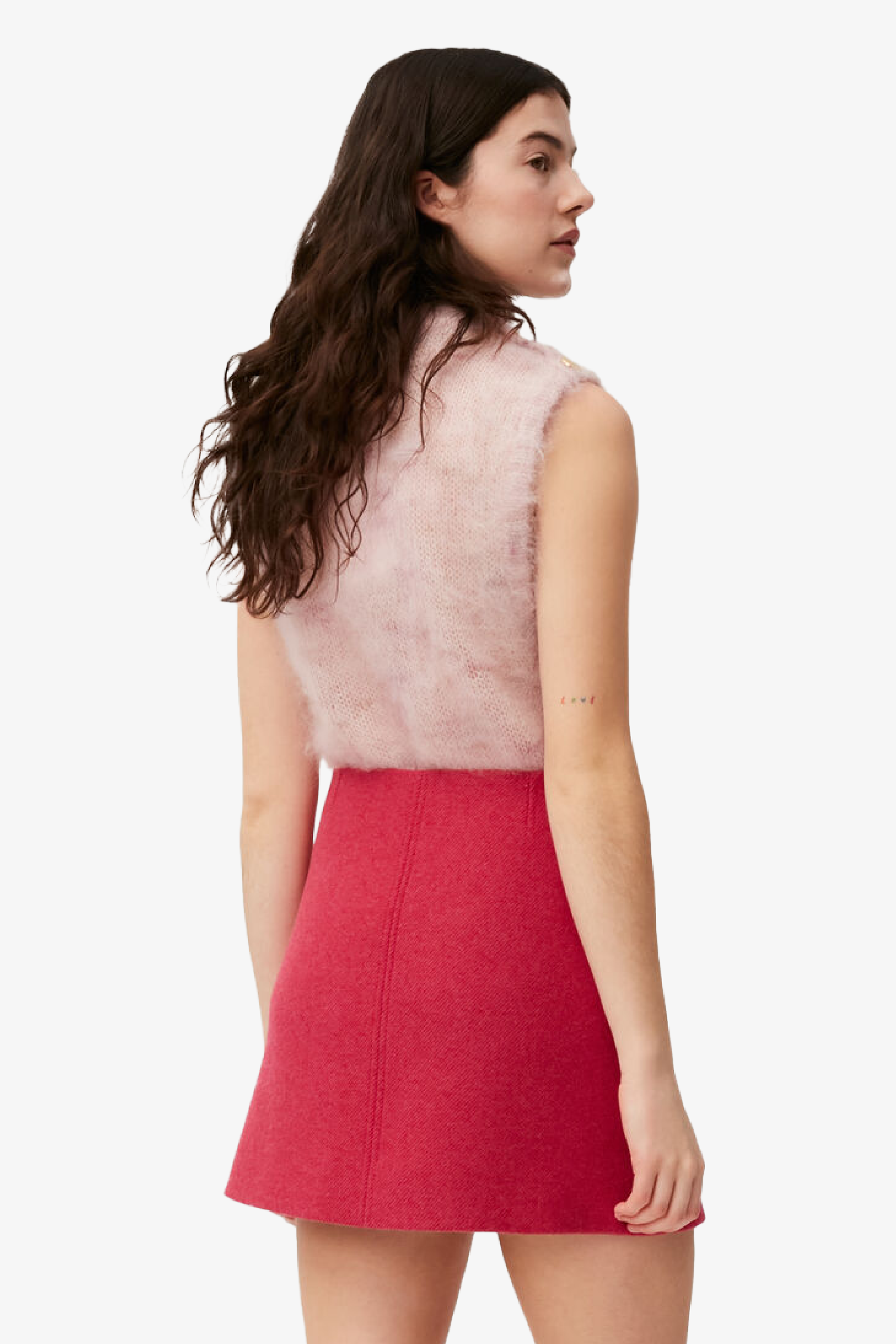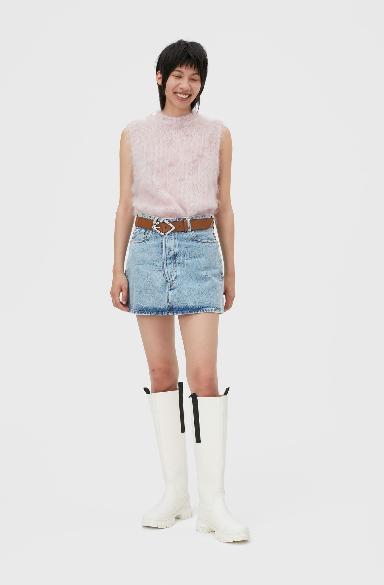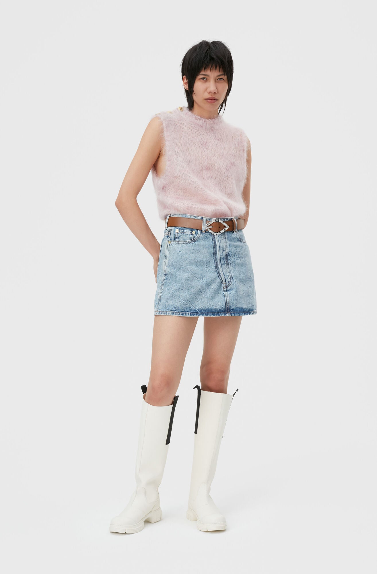 針織背心採用柔軟的馬海毛混紡面料製成,輕盈保暖,兼具彈性、高舒適度與耐穿。肩部點綴金屬質感鈕扣,為簡約輪廓增添亮點細節,展現 GANNI 獨有的活潑俏皮氛圍。