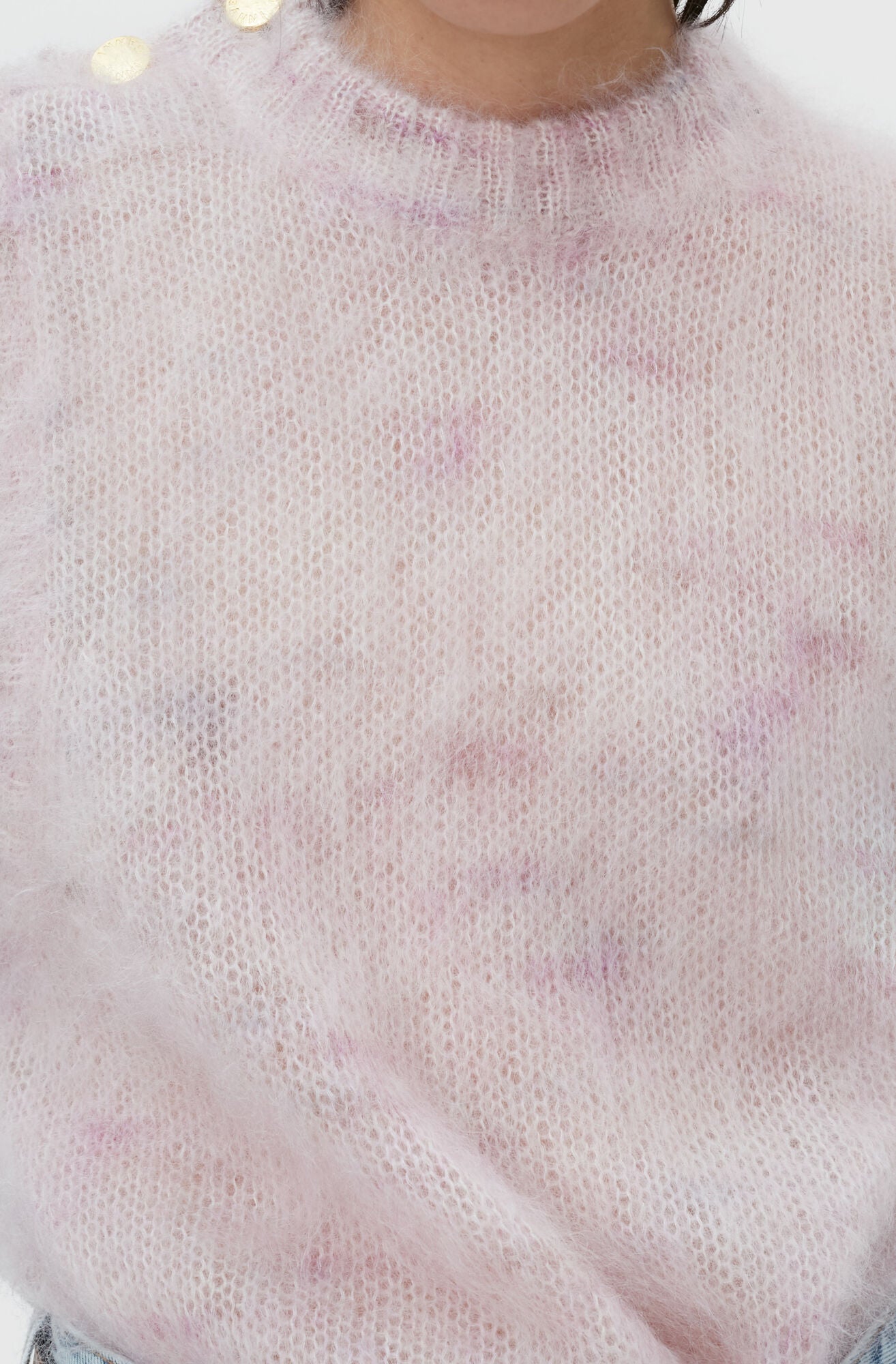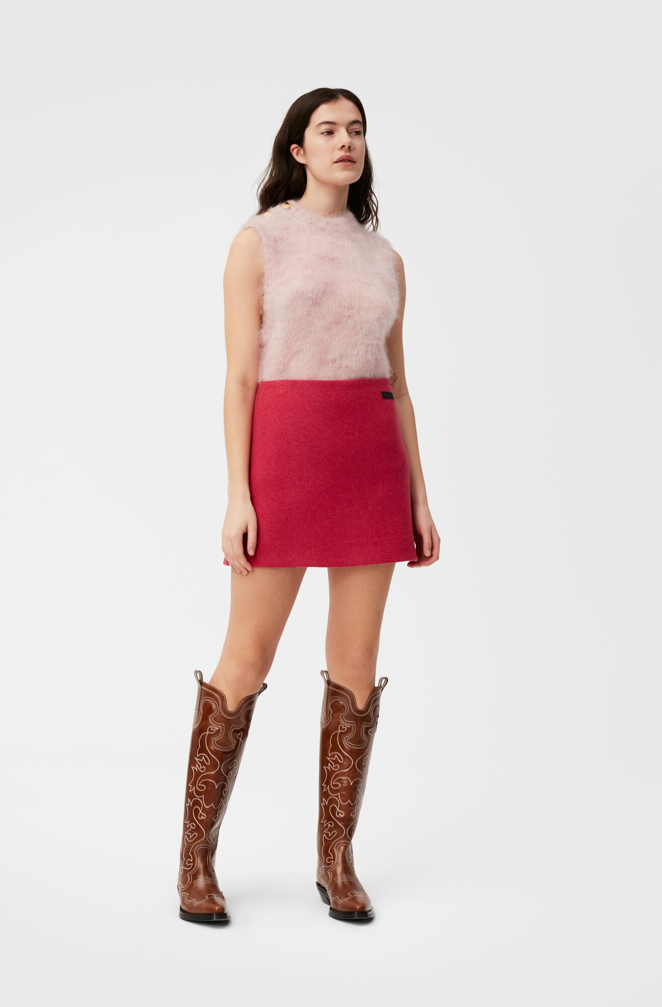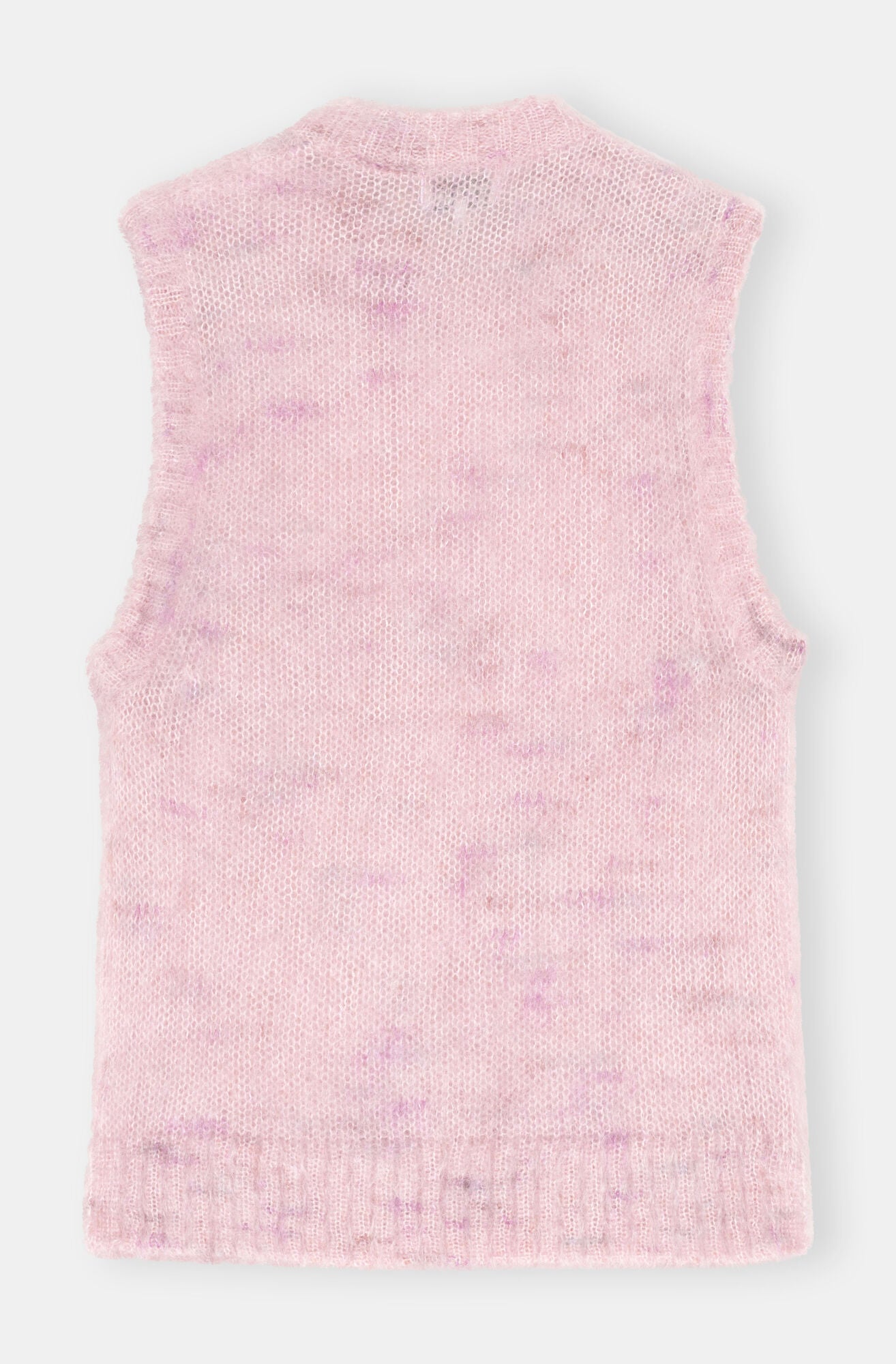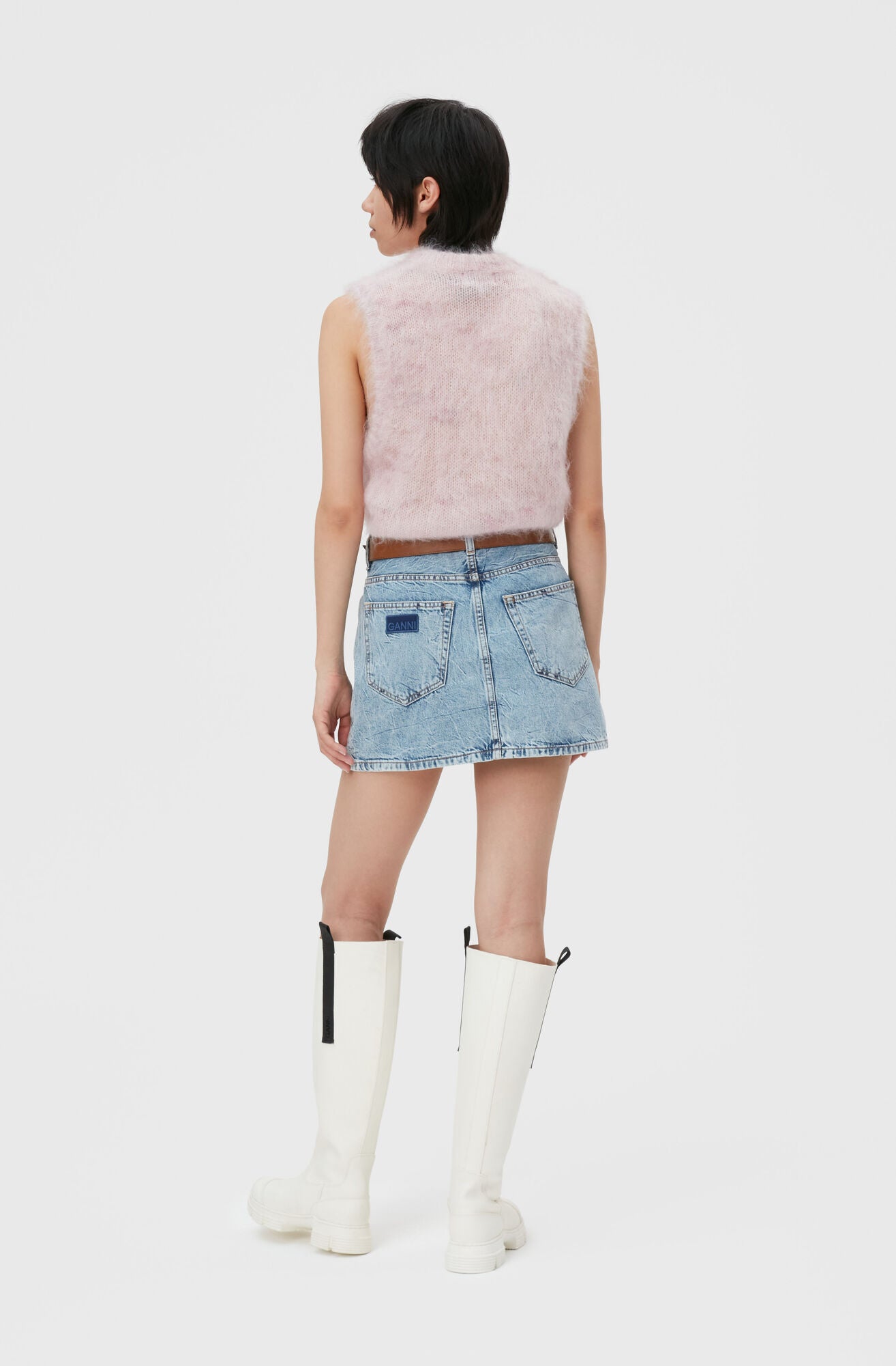 針織背心採用柔軟的馬海毛混紡面料製成,輕盈保暖,兼具彈性、高舒適度與耐穿。肩部點綴金屬質感鈕扣,為簡約輪廓增添亮點細節,展現 GANNI 獨有的活潑俏皮氛圍。